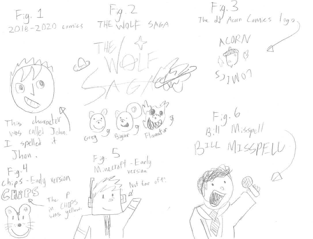 Acorn Comics technically started in 2019, when I was in 1st grade in Halifax, Nova Scotia. I drew superhero comics in my exercise book, sometimes as full comic books in my journals and sketchbooks. I drew the last one of these in 2020. Soon, in 2021, I made a comic book which changed the way I thought about comics: THE WOLF SAGA. There are six stories of this series, being each about four pages long. The series was about three silly wolves, named Grey, Bigear, and Flamefur. In 2023, MINECRAFT was written. It is now posted on this website, so check it out if you want. In a little while, I made a comic strip called Bill Misspell, about a reporter named, you guessed it, Bill Misspell. He always mixes up what he says or accidentally makes it have an alternate (and embarrassing) meaning. Then Chips comes onto the stage in 2024. Since then, I have been continuing the Chips and Minecraft series.